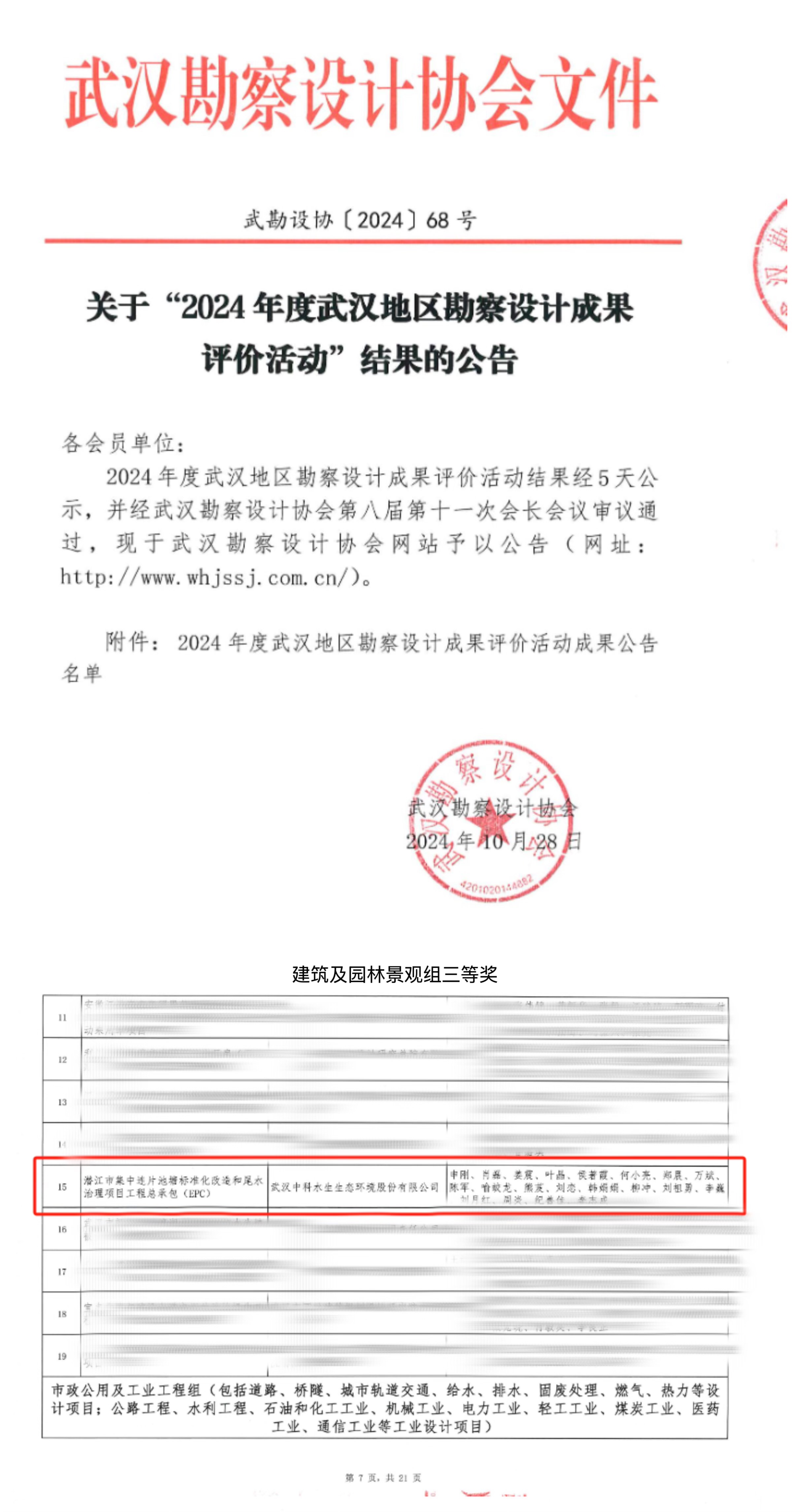 2024年,武汉中科水生公司蝉联获评武汉勘察设计协会“2023-2024年度优秀会员单位”,由公司设计的“潜江市集中连片池塘标准化改造和尾水治理项目工程总承包(EPC)”荣获武汉勘察设计协会建筑及园林景观组设计奖项三等奖。多个奖项的获得是武汉勘察设计协会对中科水生持续多年改革创新和综合设计能力的充分肯定。